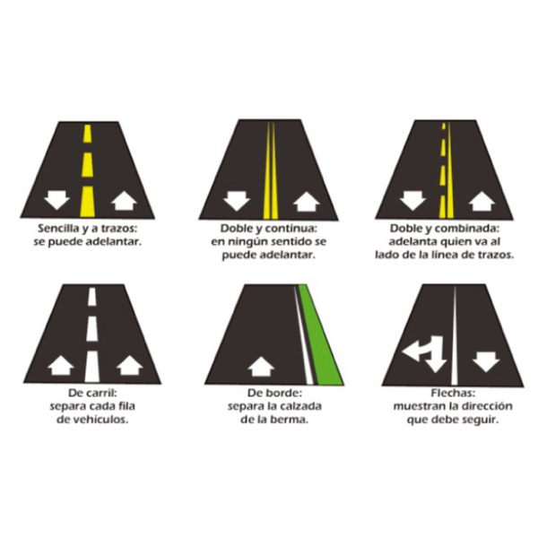 AMARILLAS: separan los carriles del tráfico que se mueven en direcciones opuestas. Si la línea es continua, indica que está prohibido adelantar. Si la línea es a trazos, se puede adelantar. Si hay doble línea amarilla, el significado es el mismo, es decir, esta prohibido adelantar y cada línea corresponde a un sentido de circulación.